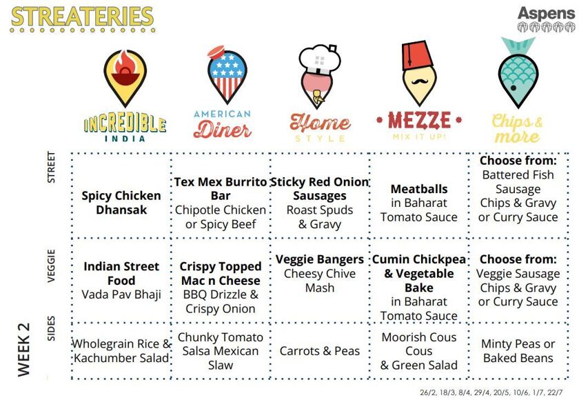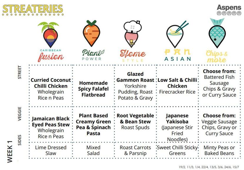 familiar school dining hall favourites. Each day the menu includes as standard a street food dish, a hand held version, vegetarian/vegan choices along with a selection of sides.