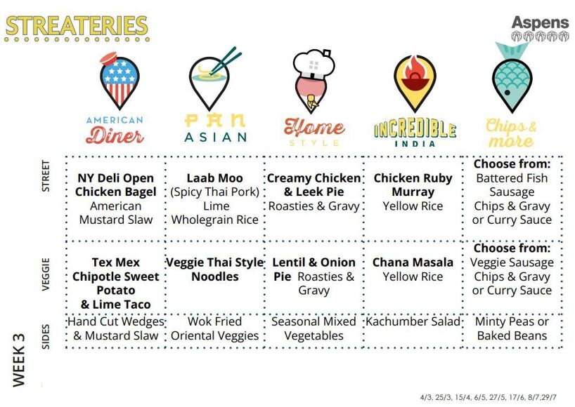 The school menu rotates on a three-week basis and refreshes for Autumn/Winter and Spring/Summer seasons.